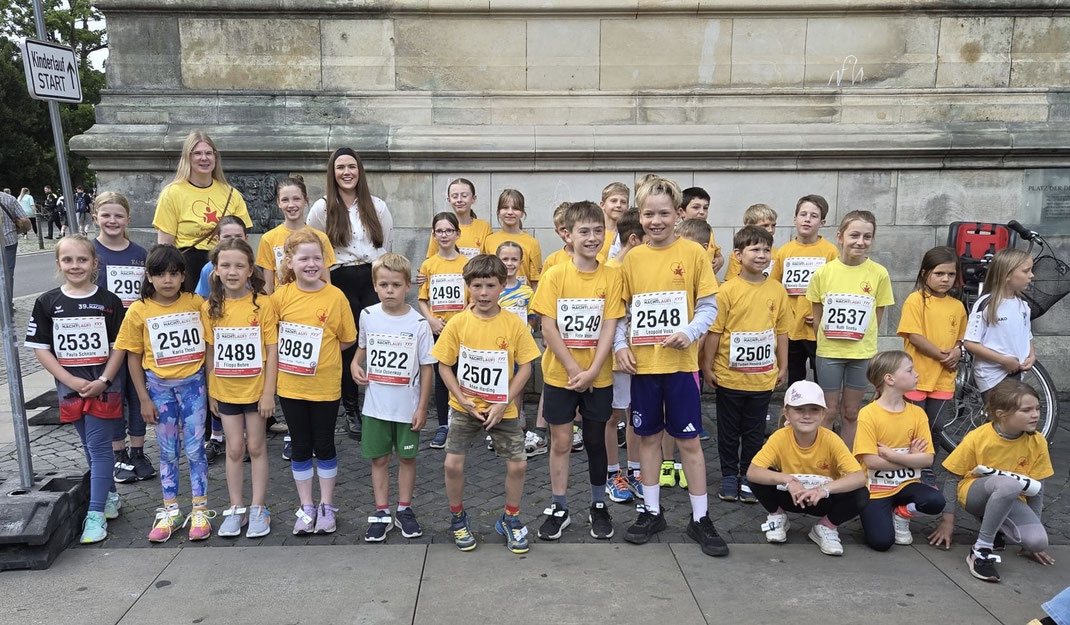 Unsere Schülerinnen und Schüler starteten voller Begeisterung beim Grundschullauf über 3.350 Meter. Mit ihren gelben Schul-T-Shirts und den gut sichtbaren Startnummern waren sie nicht zu